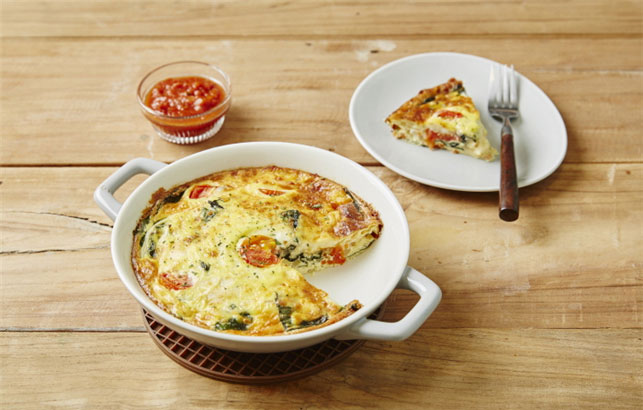 ▶주재료: 생 곤드레(70g), 양파(½개), 달걀(4개), 우유(¼컵), 생크림(¼컵), 파 르메산 치즈가루(2큰술), 모차렐라 치즈(½컵)