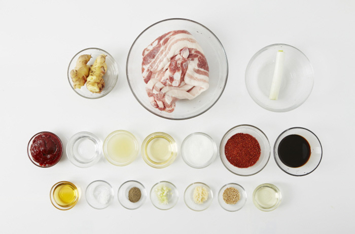 - 5. 중간 불로 달군 팬에 식용유(1)를 두르고 양념한 삼겹살을 올려 굽는다.