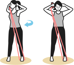 탄력밴드를 이용해 등 운동을 할 때는 척추만곡을 유지하여 허리에 압력이 가지 않게 허리부상에 주의한다.