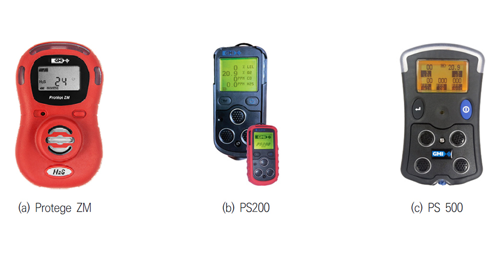 국내에서 전기화학식 가스 센서 기술을 보유한 SENKO는 다수의 휴대용 가스감지기를 개발하고 있다. 이 중 휴대용 복합가스 감지기(MGT)는 4가지 가스(산소, 일산화탄소, 황화수소, 가연성가스)의 농도를 동시에 측정하며, 기준치 이상의 가스 농도 검지 시 경고음, LED, 진동의 복합경보를 발생한다. 무게 240g, 60×118×40mm의 크기로 국내에서 약 50만 원 선에 판매되고 있다. [그림 4]는 SENKO에서 개발한 휴대용 가스감지기 중 일부 모델을 보여준다[5].