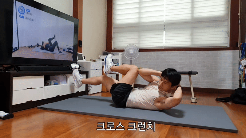 상‧하복근 운동을 했다면 이제는 옆구리 강화 운동인 트위스트 크런치로 외복사근 운동을 진행합니다. 복근이 약한 여성분이라면 한쪽 다리는 바닥에 붙여서 진행하고 남성의 경우에는 양 다리가 매트 위에 떠 있는 상태로 팔과 다리를 교차하며 트위스트 크런치를 해줍니다.