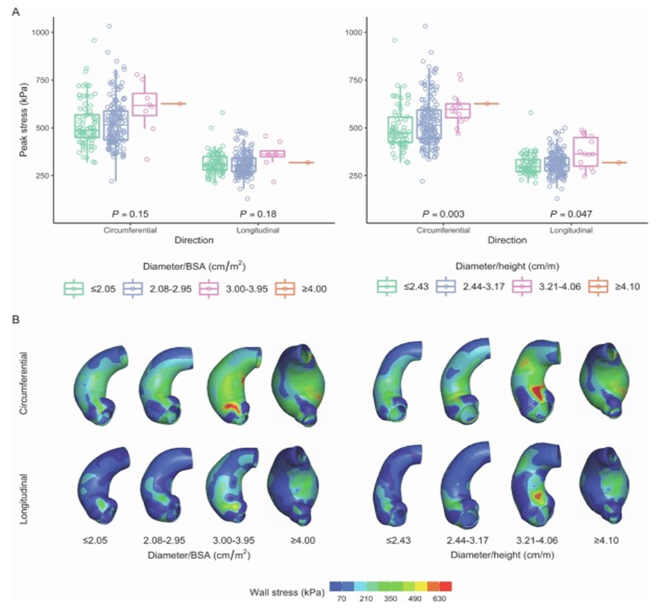 일례로 Schussnig와 Holzapfel et al. 그룹은 혈관벽의 변형-응력 관계를 간단한 구성방정식부터 복잡한 구성방정식까지 구현할 수 있는 전산 유체-구조 상호작용 해석 모델을 개발하였고 경계조건과 구성방정식을 어떻게 적용하느냐에 따라서 대동맥류의 혈류역학적, 생체역학적 파라미터값이 크게 변할 수 있음을 보고하였다 [5]. 경계조건이나 혈관벽의 구성방정식을 복잡한 모델을 활용하여 구현이 가능하지만 복잡한 모델의 파라미터값을 어떻게 환자 맞춤형으로 정할지가 향후 연구 주제로 제시되었다. Duca와 Vagara et al. 그룹은 이상적인 모델과 환자 모델을 이용하여 유체-구조 상호작용 해석을 이용해 대동맥류 시술 전후의 혈류역학, 생체역학 파라미터값들을 비교하여 시술 후의 예후를 예측하였다 [6]. Zamirpour et al. 그룹은 대동맥류 환자들의 예후와 혈류역학 파라미터값을 비교하여 혈류역학 파라미터를 고려하는 것이 대동맥류 환자들의 예후를 보다 더 잘 예측하는 것을 보고하였다 [7]. Zhu et al. 그룹은 혈관벽의 물성값이 혈류역학 파라미터값에 영향을 주는 연구를 보고하였다 [8].