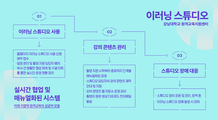 이러닝 스튜디오는 강의 콘텐츠 제작 전반을 지원하는 핵심 시설로 자리 잡았다. 이러닝 스튜디오 사용 신청부터 촬영, 편집, 배포 등 콘텐츠 관리까지 모든 과정을 전산화하여 효율적인 관리가 가능하며, 전문 매뉴얼을 기반으로 장비 관리와 체계적 장애 대응까지 3단계 시스템 구축으로 안정적인 원격수업 제작 환경을 갖추고 있다.