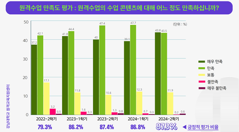 대학혁신지원사업을 통해 원격수업에 대한 학생들의 요구사항 반영 및 지속적인 개선으로 매학기 시행하는 학생 대상 원격수업 만족도 평가 결과 2024-2학기 기준(총 응답자 1,204명) 87.3%의 높은 긍정 평가를 달성하였다.