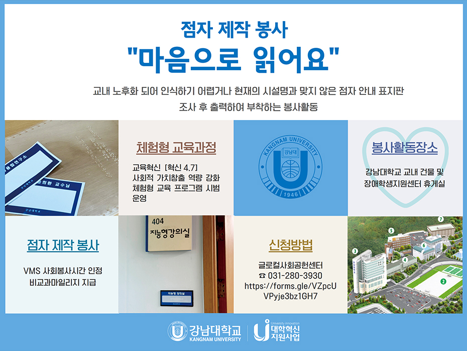 저는 2024학년도 1학기 강남대학교 글로컬사회공헌센터에서 진행한 대학혁신지원사업 체험형 교육과정 개발 점자 제작 봉사에 참여하였습니다.