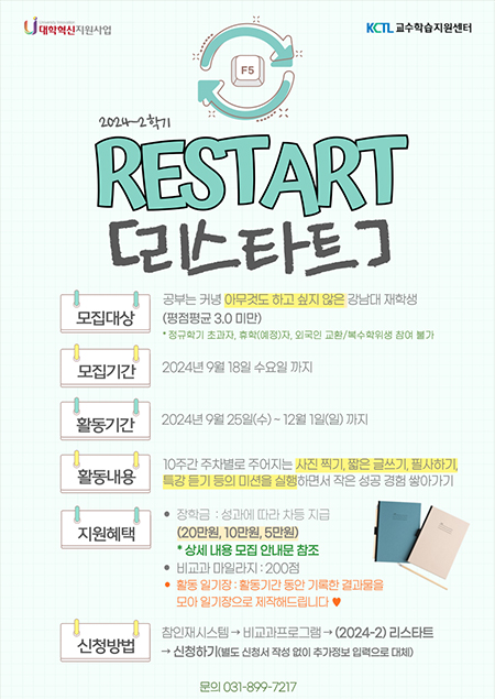강남대학교 교수학습지원센터 리스타트[RESTART] 프로그램은 제 학업 여정에서 가장 의미 있는 전환점이었습니다. 2022년 편입학 후 학교 적응과 학업 동기 부족으로 어려움을 겪었고, 출석 미달로 제적되며 학사경고를 받는 등 많은 고난이 있었습니다.
