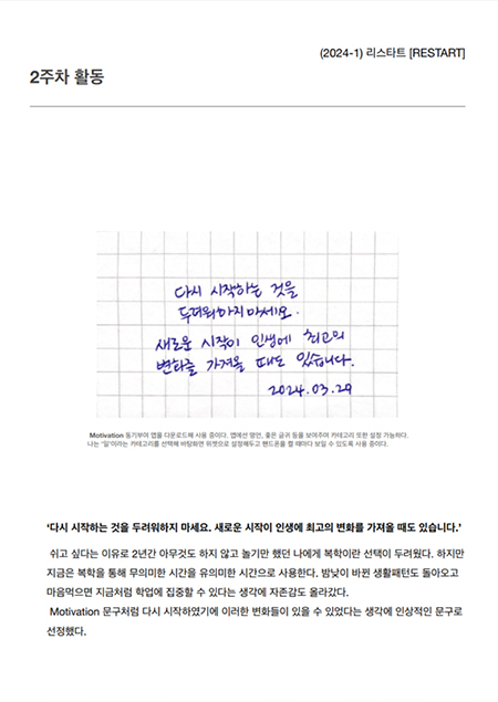 리스타트는 단순히 학업 성적을 향상시키기 위한 프로그램이 아니라, 열심히 노력하는 모습을 지켜봐주고 격려와 지원은 제게 동기 부여가 되었습니다.