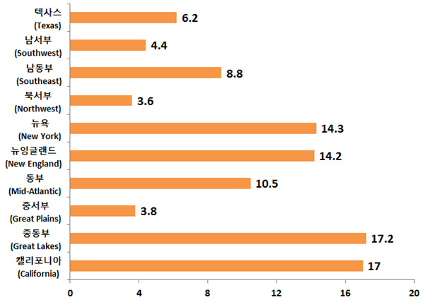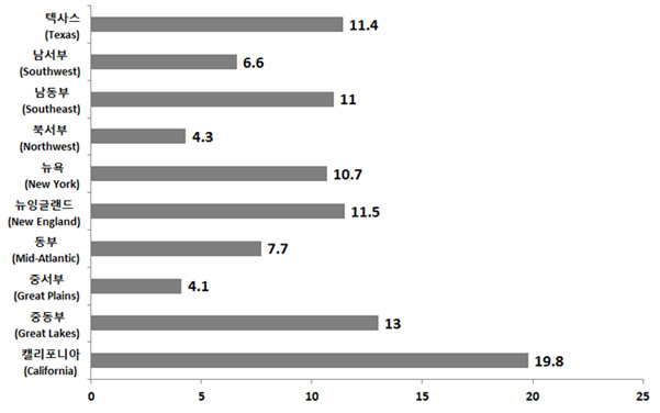 - 2014년 투자수량에 따른 지역별 투자 비중은 캘리포니아(19.8%), 중동부(13.0%), 뉴잉글랜드(11.5%), 텍사스(11.4%)순으로 나타남