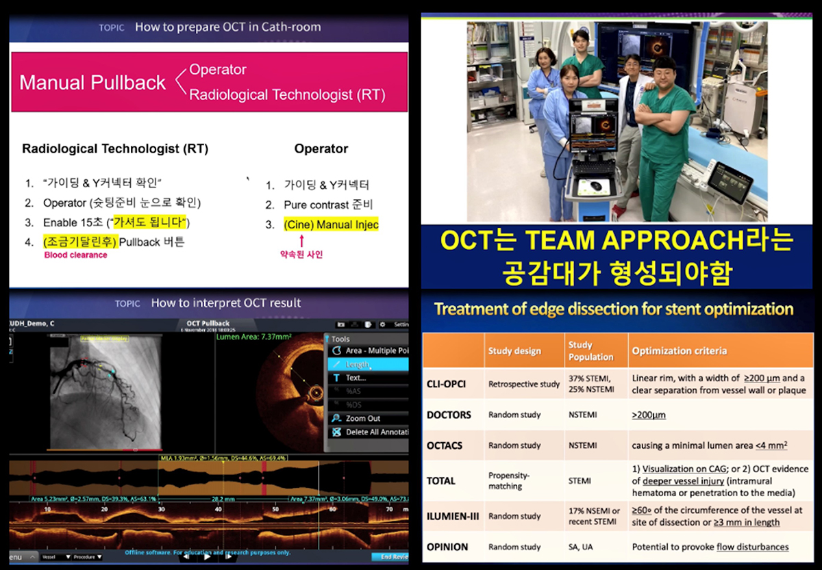 IPOP에서 코로나 판데믹 상황에 발맞추어 기획한 온라인 웨비나, 그 첫 번째 행사가 2022년4월 19일 수요일 저녁 성황리에 이루어졌습니다. 그 첫번째 시간으로 많은 분들이 관심을 가지고 있지만 막상 실제 임상에서 활용하는데 애로를 겪고 있는 광학적 단층촬영술 (OCT)의 활용에 대한 주제로 준비가 되었는데 특히 중재시술의사 뿐만 아니라 방사선사 및 간호사까지 함께 참여할 수 있도록 준비되었습니다. 허승호 IPOP 회장 (계명대학교 동산병원)과 홍명기 2대 IPOP 회장 (연세대학교 신촌세브란스병원)께서 온라인 moderator로서 웨비나를 이끌어주셨고, 라이브 채팅과 퀴즈를 통한 온라인 참석자와의 활발한 참여도 함께 이루어졌습니다. 이번 웨비나에서는 강준원 KCTA 회장 (고려대 안암병원) 이 ‘How to prepare OCT in Cath-Room’이란 제목으로 OCT의 기본 세팅과 준비과정에 대해서 강의해 주셨고 김용철 교수 (용인세브란스병원)가 ‘How to obtain good OCT image’란 제목으로 OCT의 좋은 영상을 얻을 수 있는 노하우에 대해서 전수해 주셨습니다. 윤혁준 교수 (계명대학교 동산병원)는 ‘How to interpret OCT result’의 제목으로 OCT 영상 획득 이후 해석과 활용법에 대해서 실제 OCT 프로그램을 이용해 강의해주었고 마지막으로 김병극 교수 (연세의대 신촌세브란스 병원)의 ‘How to optimize PCI using OCT’ 강의를 통해서 OCT guided PCI의 실제에 대해서 같이 알아보는 시간이었습니다. 앞으로도 이어질 IPOP의 온라인 웨비나에 많은 관심과 참여를 부탁 드립니다.