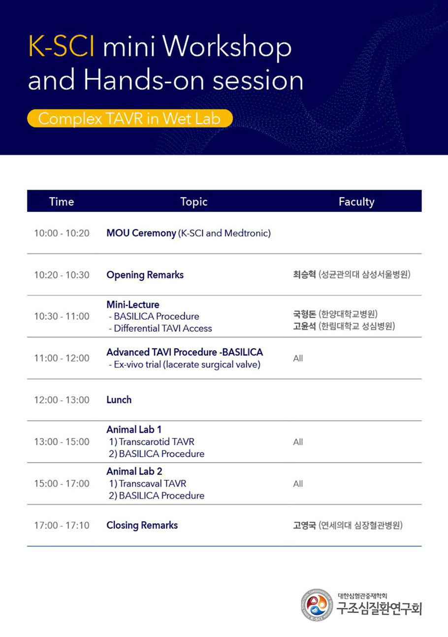 | 신청 방법 | 이메일 신청: 대한심혈관중재학회 구조심질환연구회 부총무 고윤석 : kyoonseok@naver.com) - 신청기간: 9월 21일 접수 마감 - 신청 시 기재 사항