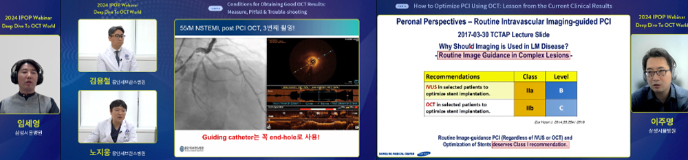2024년 1월 24일 수요일 IPOP에서 준비한 4번째 웨비나인 ‘Deep Dive To OCT World’가 온라인으로 개최되었습니다. 이번 웨비나에서는 삼성서울병원의 임세영 방사선사의 ‘Step by Step Instruction for OCT preparation in Cath-Room’ 강의가 있었고 용인세브란스병원의 김용철, 노지웅교수님이 ‘Conditions for Obtaining Good OCT Results’ 강의를 통해서 실제적인 OCT의 활용도를 높이는 방법에 대해서 경험을 공유해 주었습니다. 그리고 삼성서울병원의 이주명 교수가 ‘How to Optimize PCI using OCT’ 강의를 통해서 최근 Clinical Trial의 소개와 임상에서의 의미에 대해서 정리를 해 주었습니다.