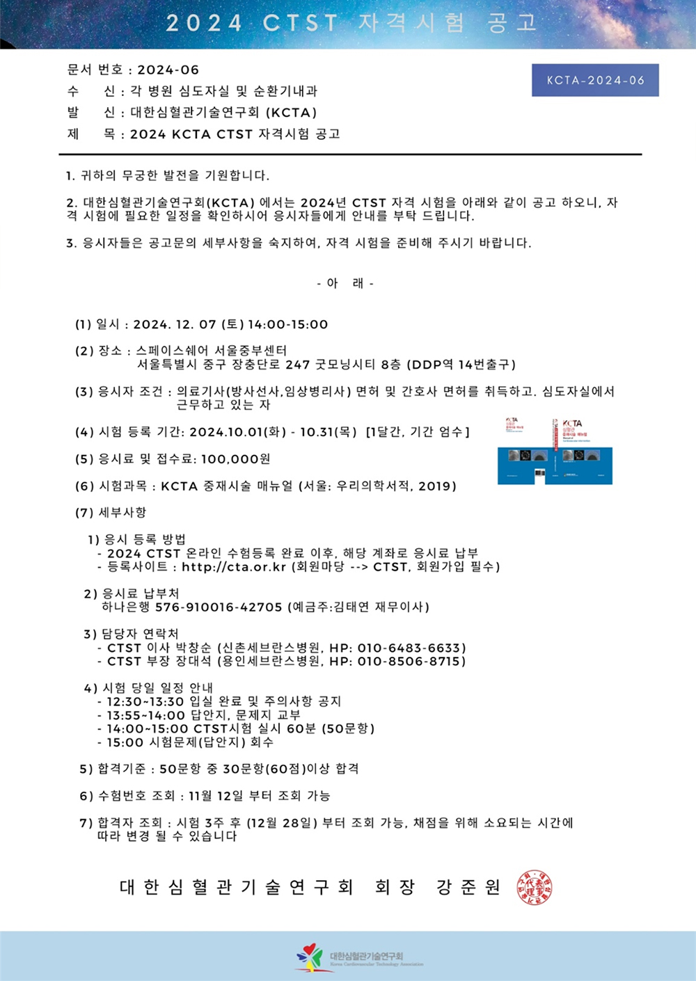 대한 심혈관 기술연구회는 심혈관 중재시술 분야의 전문가 양성을 위해 아래와 같이 2024년 KCTA 자격시험을 시행합니다. 이번 시험은 심혈관 중재시술 인증과 관련하여 신규로 자격 취득이 필요한 간호사 및 의료기사를 대상으로 하며, 여러분의 전문성과 역량을 한층 더 높일 수 있는 기회가 될 것입니다. 시험일정을 아래와 같이 공지하오니 수험생 여러분들께서는 숙지하시고 시험에 응시하여 주시기 바랍니다