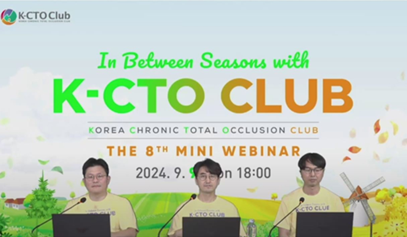 제 8회 K-CTO의 미니 웨비나 행사가 2024년 9월 9일 성공적으로 열렸습니다. 한정규 교수님, 이종영 교수님, 신상훈 교수님께서 진행을 맡아주셨고, 연자는 두 분으로, 은평성모병원 최연직 교수님(Bidirectional approach to long RCA CTO) 과 경상대학교병원 강민규 교수님 (Stumpless proximal LAD CTO blocked by heavy calcium lesion) 께서 맡아 주셨습니다.