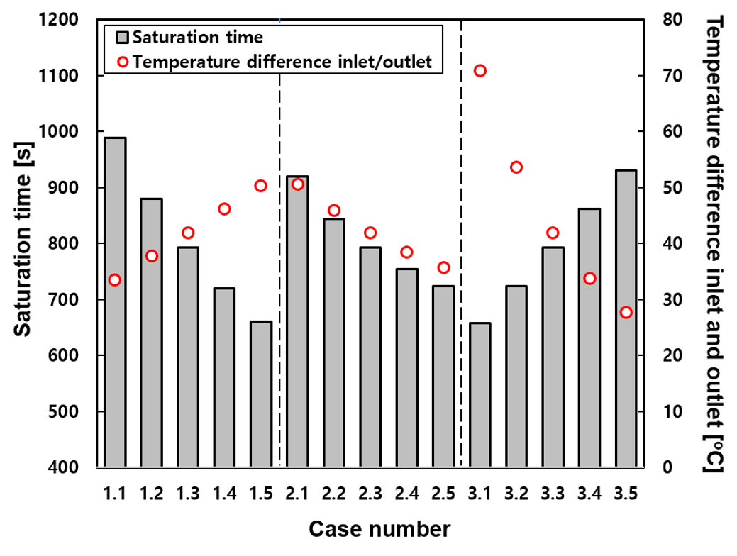 고온 공기의 유량이 커질수록, 온도 차이 변수보다 승온 속도 개선 정도가 낮으나 승온 속도가 개선 되었으며, 입구와 출구 사이의 온도차도 줄었음