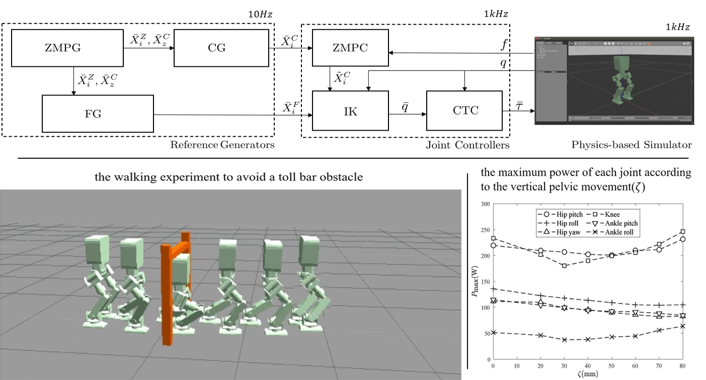 골반의 수직 움직임을 고려한 미리보기 제어(preview control)를 사용하면 골반의 수직 움직임이 큰 보행에서도 안정적으로 보행할 수 있음을 확인함.