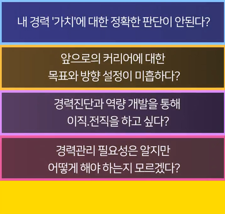 교육 내용은 전직 지원 직업상담사들이 실제 현업에서 활용하는 모듈을 기본으로 했다. 경력 개발 프로세스, 경력 진단, 커리어 방향 확인, 커리어 가능성 등 경력 개발 계획을 수립해보고 방법을 찾아가는 거다.