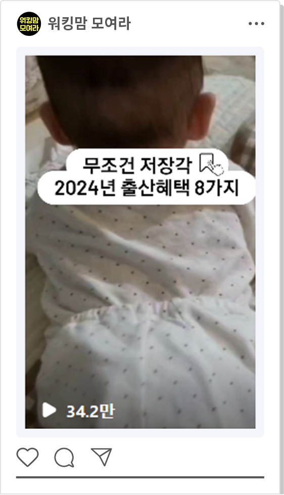 <워킹맘 모여라>란 인스타그램 계정인데, 처음에 포지셔닝을 할 때 약간 코칭을 해주었다. 엄마들 대상 부업 소개 이런 방향이 아니라 워킹맘을 목표 대상으로 하는 정보 제공 컨텐츠로 하라고 코칭했다. 부업 소개는 너무 광고 같기도 하고 지금도 흔하다. 처음에는 “4년 차 워킹맘의 식비 절약 꿀팁 3가지” 공개하기라는 컨텐츠를 올렸고, 조회 수가 2주 만에 12만 건 터진 건 “무조건 저장각, 2024년 출산 혜택 8가지”이다. [12.12. 기준 조회 수는 34만 2천 건으로, 이 대표는 인터뷰 당일 조회 수 30만 건을 넘길 것이라고 예상했다.] 팀원이 둘 다 20대인데 친언니, 사촌 언니 아기 영상을 갖고 정보성 컨텐츠를 귀엽게 잘 만들었다. 사람들이 클릭할 수 있게 이런 문구가 딱 나와줘야 한다.