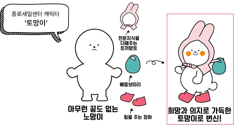 직훈 첫해 프로젝트 과제 중 하나로 수강생들이 직접 아이디어를 구상부터 이미지 작업, 발표까지 하면서 ‘종로센터 캐릭터 만들기’를 진행했었다. 이후 평가를 통해서 최종 우수작을 선정했는데, 그 결과 탄생한 캐릭터가 ‘토망이’이다. 이후 센터의 전단지나 홍보물 등에 활용하면서 교육의 성과를 실질적으로 체감할 수 있어 매우 뿌듯했던 기억이 있다.