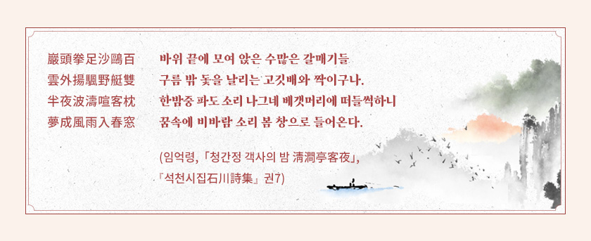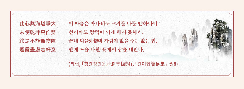 최립은 자신의 마음을 바다와 비교하고 천지와 비교하면서, 천지자연의 광활함으로도 비교할 수 없는 마음의 광대무변함을 드러낸다. 청간정에 오르면 눈앞으로 펼쳐지는 바다를 보면서, 그는 무한한 자연 앞에서 인간 마음의 위대함을 새삼 느낀다. 마음의 무한함에 비하면 인간의 신체적 한계는 너무도 명확한 법이어서, 청간정 창문을 닫는 행위를 통해서 그는 외물의 장애에 대한 인식 역시 분명하게 드러낸다. 이러한 시풍은 최립이 간성군수로 재직하던 시기에 주로 보이는 자연의 탈속미와 그에 따른 정심(精深)한 시풍과 일정한 연계를 가지는 것이기도 하다. 그런데 이 작품의 제목은 「청간정판운(淸澗亭板韻)」이다. 그가 청간정에서 이 작품을 온전히 자신의 운자로 쓴 것이 아니라 그가 이곳을 방문하기 이전에 누군가가 써서 정자에 걸어두었던 시판의 운자를 빌려서 쓴, 일종의 차운시라는 것이다. 최립은 누구의 시에 차운한 것일까. 바로 조선 중기의 뛰어난 문인 석천(石川) 임억령(林億齡, 1496~1568)의 시이다. |