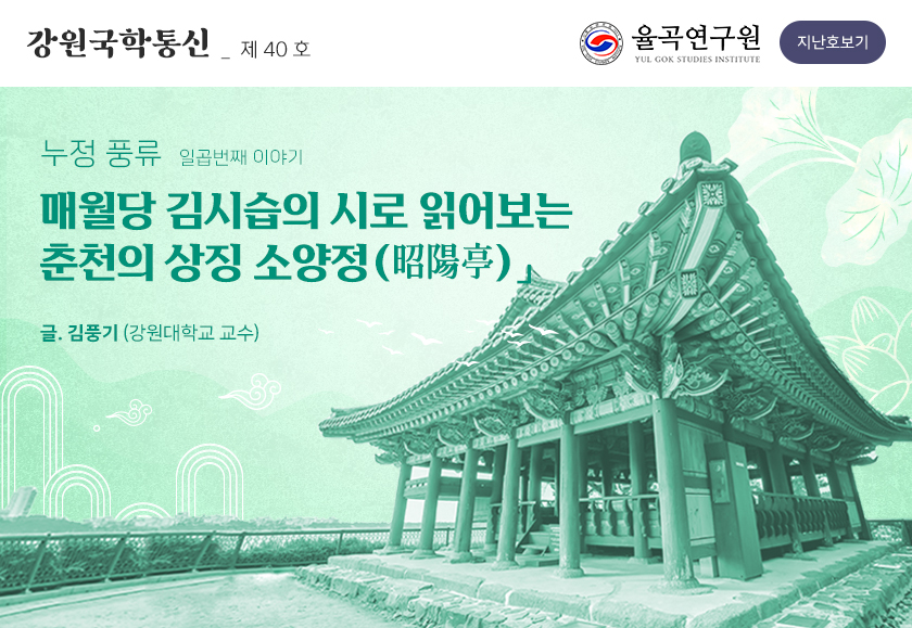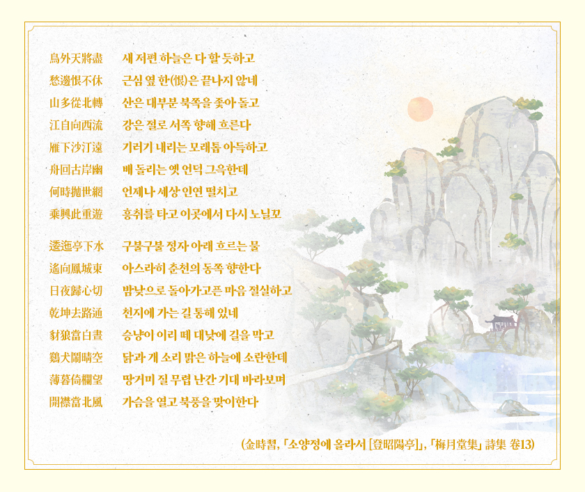 우리는 김시습의 행적에서 흔히 방랑과 비판의 정신을 읽곤 한다. 김시습은 어떤 인물인가. 보잘것없는 가문에서 태어난 그는, 자신의 뛰어난 재주를 바탕으로 뭇 사람들의 눈길을 한몸에 받으면서 자라난다. 사람들의 기대를 한 몸에 받던 그의 삶이 예기치 않던 사건으로 삐끗하게 된 것은 바로 수양대군의 왕위 찬탈 사건이었다. 김시습은 당시 삼각산에 있는 절에서 글을 읽고 있었다 한다. 쿠데타 소식을 접한 김시습은 삼 일 동안 아무것도 먹지 않고 바깥출입도 하지 않은 채 깊은 침묵에 빠졌다고 한다. 그리고는 그 길로 길고 긴 방랑을 시작한다. 위에서 소개한 시는 김시습의 「관동일록(關東日錄)」 안에 수록되어 있다. 정확히 언제 지은 것인지는 알 수 없으나, 작품 배열이 여행지 순서로 되어 있는 것으로 미루어 아마도 그가 37세에서 48세까지 약 10년간의 성동은거기(城東隱居期)를 마치고 다시 관동으로 방랑을 떠났을 때의 것으로 추정된다. 일반적으로 정자에서 노닐면서 지은 시들이 주위의 풍광이나 자신의 흥겨운 회포를 노래하는 반면 김시습의 이 시는 자신의 고민과 갈등을 소양정 주변의 경관과 관련하여 잘 형상화하고 있다는 점에서 흥미로운 작품이다. |