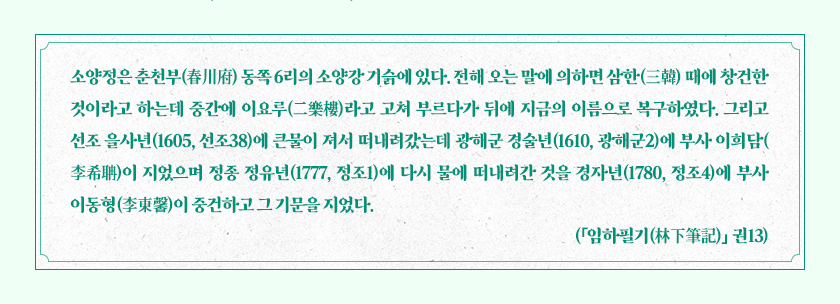 | 소양강 처녀상이 있는 강가에서 봉의산 쪽을 바라보면 산기슭에 날렵한 정자 하나가 보인다. 소양정(昭陽亭)이다. 1984년 강원도 문화재자료 제1호로 지정된 이 정자는 춘천 문화의 상징으로 꼽힌다. 삼국시대에 건립되었다고는 하지만 사실은 건립 연대를 추정하는 것은 불가능하다. 조선 말기에 소양정의 역사를 간략하게 기록한 이유원(李裕元: 1814~1888)의 글이 요령 있다. |